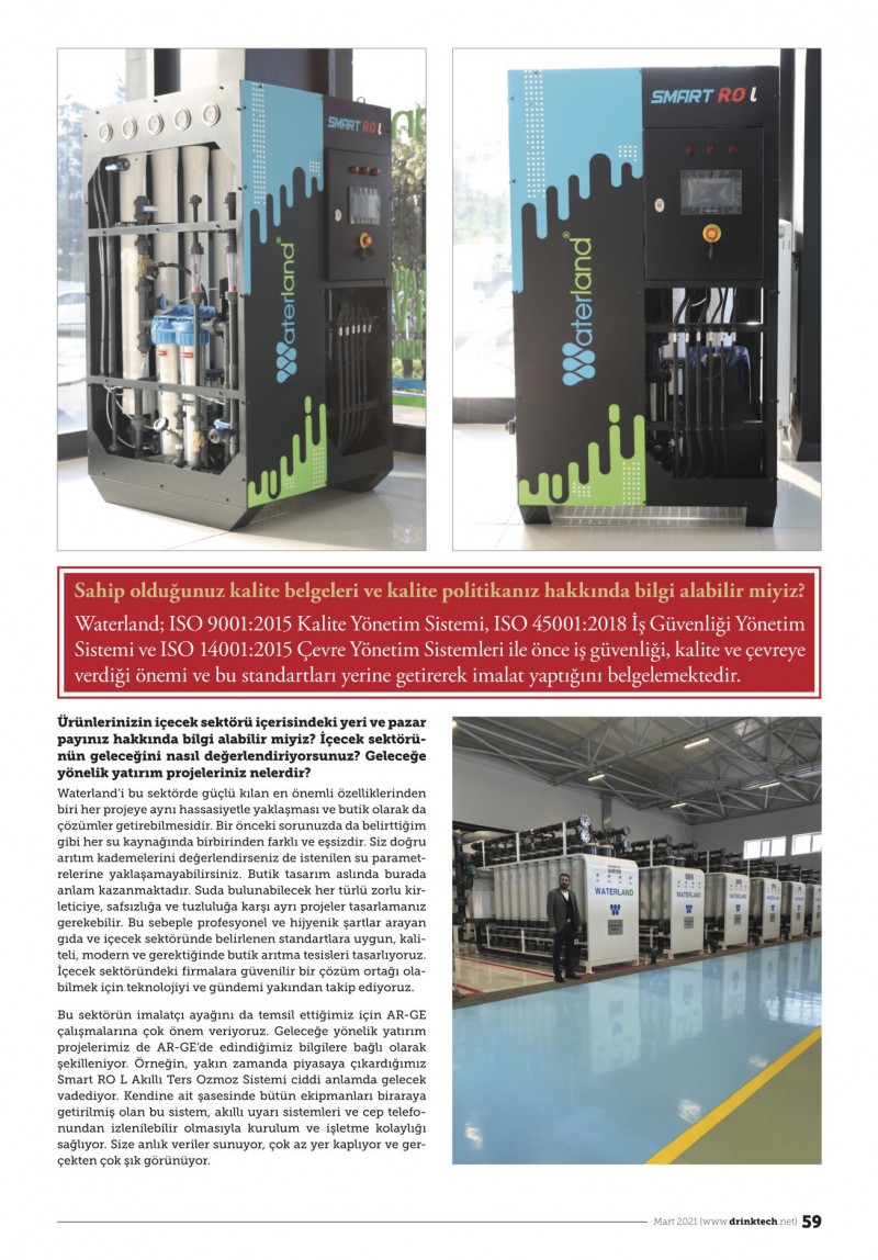 Bu sektörün imalatçı ayağını da temsil ettiğimiz için AR-GE çalışmalarına çok önem veriyoruz. Geleceğe yönelik yatırım projelerimiz de AR-GE’de edindiğimiz bilgilere bağlı olarak şekilleniyor. Örneğin, yakın zamanda piyasaya çıkardığımız Smart RO L Akıllı Ters Ozmoz Sistemi ciddi anlamda gelecek vadediyor. Kendine ait şasesinde bütün ekipmanları biraraya getirilmiş olan bu sistem, akıllı uyarı sistemleri ve cep telefonundan izlenilebilir olmasıyla kurulum ve işletme kolaylığı sağlıyor. Size anlık veriler sunuyor, çok az yer kaplıyor ve gerçekten çok şık görünüyor.