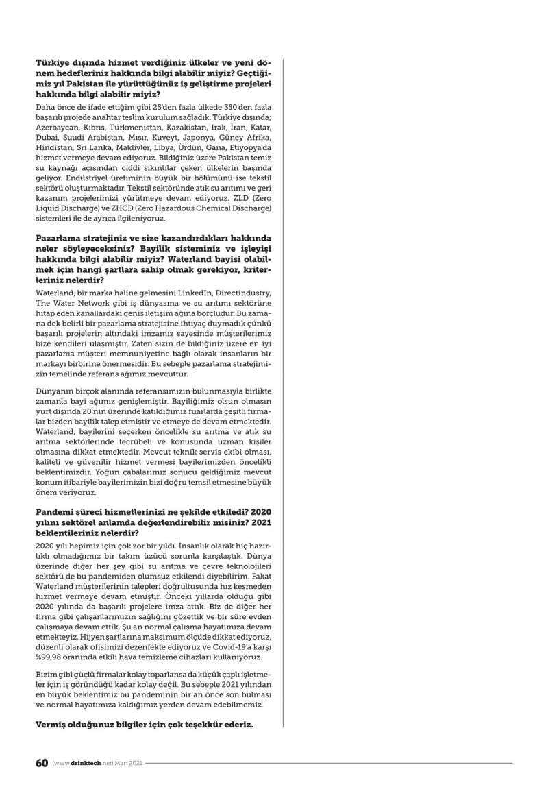 2020 yılı hepimiz için çok zor bir yıldı. İnsanlık olarak hiç hazırlıklı olmadığımız bir takım üzücü sorunla karşılaştık. Dünya üzerinde diğer her şey gibi su arıtma ve çevre teknolojileri sektörü de bu pandemiden olumsuz etkilendi diyebilirim. Fakat Waterland müşterilerinin talepleri doğrultusunda hız kesmeden hizmet vermeye devam etmiştir. Önceki yıllarda olduğu gibi 2020 yılında da başarılı projelere imza attık. Biz de diğer her firma gibi çalışanlarımızın sağlığını gözettik ve bir süre evden çalışmaya devam ettik. Şu an normal çalışma hayatımıza devam etmekteyiz. Hijyen şartlarına maksimum ölçüde dikkat ediyoruz, düzenli olarak ofisimizi dezenfekte ediyoruz ve Covid-19’a karşı %99,98 oranında etkili hava temizleme cihazları kullanıyoruz. Bizim gibi güçlü firmalar kolay toparlansa da küçük çaplı işletmeler için iş göründüğü kadar kolay değil. Bu sebeple 2021 yılından en büyük beklentimiz bu pandeminin bir an önce son bulması ve normal hayatımıza kaldığımız yerden devam edebilmemiz.